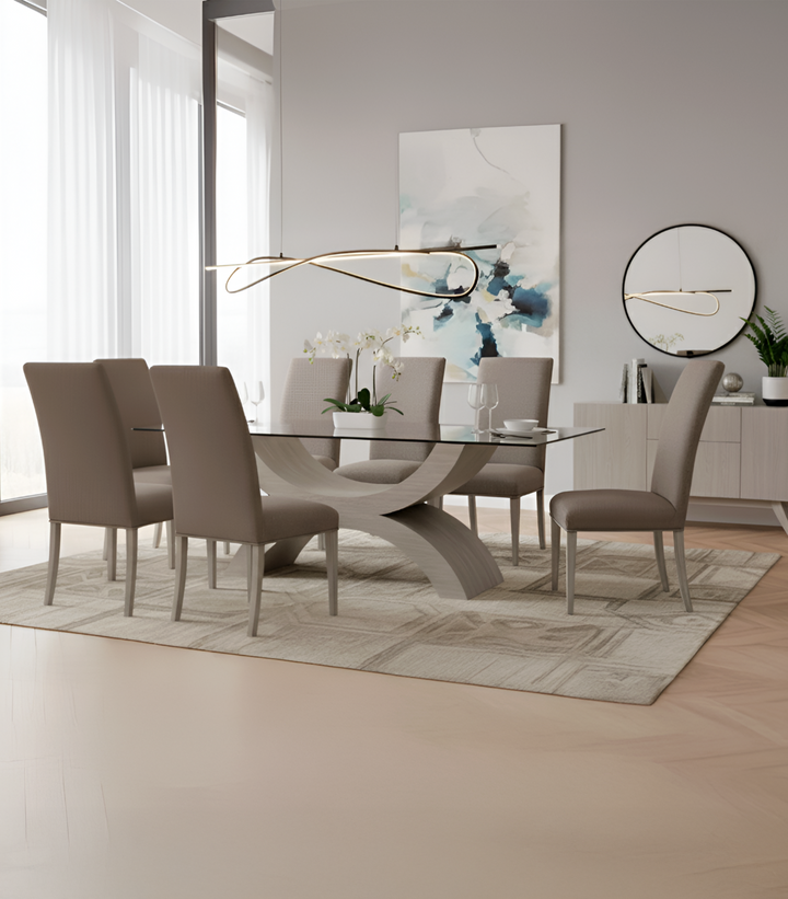 El comedor Balance es la elección perfecta para aquellos que desean crear un ambiente sofisticado y acogedor en su hogar. Su diseño moderno y elegante combina una base sólida de madera con una cubierta de cristal que destaca por su estilo y durabilidad, mientras que las 8 sillas tapizadas en tela suave brindan un confort excepcional.