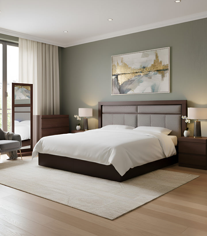 Recámara King Size Alba de madera color café - Incluye Cabecera, 2 buró, cajonera y espejo.