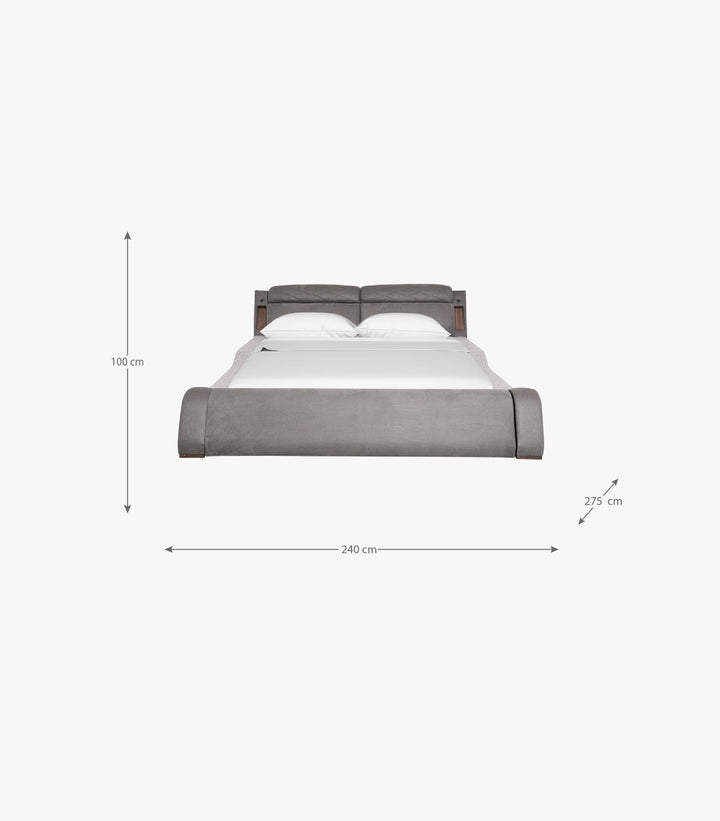 Cama King Size Booyer tapizada en tela color gris.