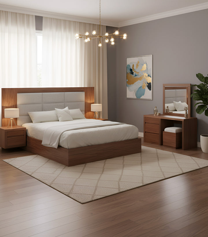 Recámara King Size Malibu de madera color café - Incluye Cabecera, 2 burós y vanity con taburete.